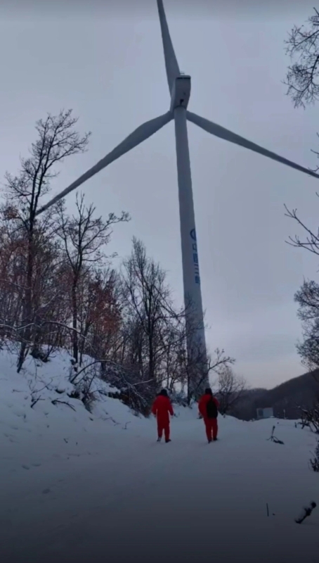 ▲ 宾县大个岭风电场运维人员于全和王鑫力赶往故障风机进行检修维护