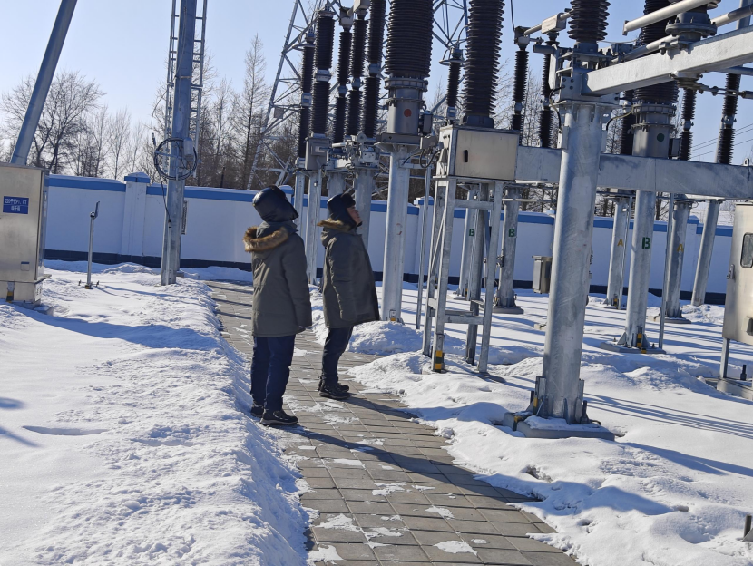 在升压站现场,当值班长李帅带着值班员钟伟,穿着厚实的工作服,顶着寒风开展日常设备巡检。