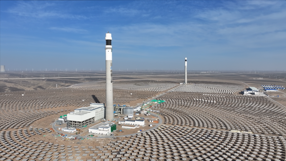 项目现场,工程师彭世德摘下沾满沙尘的护目镜,指向镜场核心区——围绕双塔而建的椭圆形聚光阵列说:“作为全球首个‘双塔一机’风光热储一体化项目,目前厂区设备安装已基本完成,镜场安装已完成80%,厂区调试、罐区化盐注盐等关键工序正同步推进,确保实现新年‘开局稳’。”