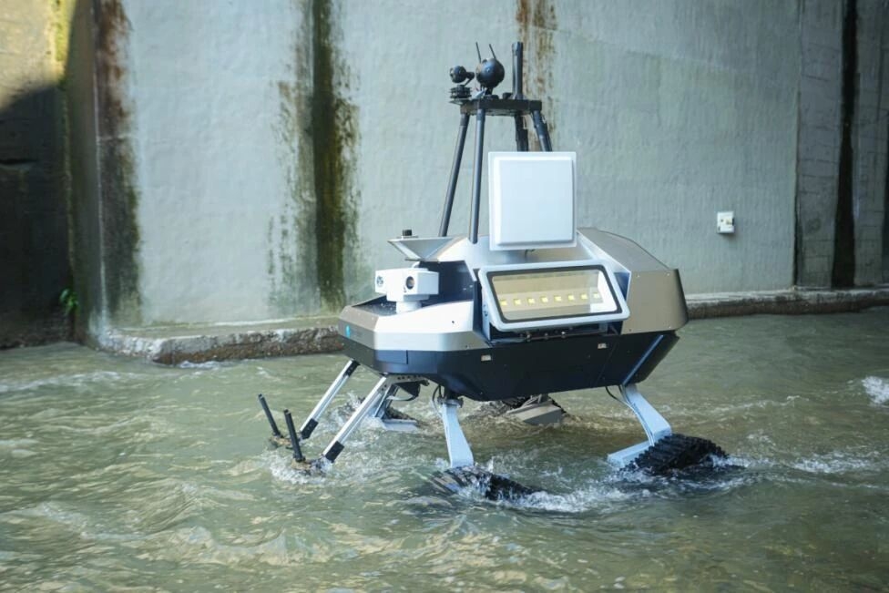 “泄水隧洞内的安全情况,以前全靠人工检测,效率较低。‘智行者’机器人为检测泄水隧洞量身打造,高约2米,腿长约0.7米,可在复杂的地形中行走、涉水、转弯等;‘他’的肚子搭载电池、照明等设备,头部装有红外和可见光摄像头双光热成像相机,可检测环境温度变化,判断隧洞是否漏水;‘他’头上还配备全景高清摄像机,可帮助完成3D建模,对比历史数据、智能检测,帮我们及时发现问题,可以说是我的智慧‘工友’。”冯新怡笑着说道。