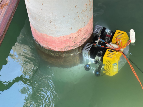 杨家湾码头下方的承重钢管桩上,“潜行者”机器人正贴附在承重钢管桩上,帮助清理钢管桩表面锈迹。