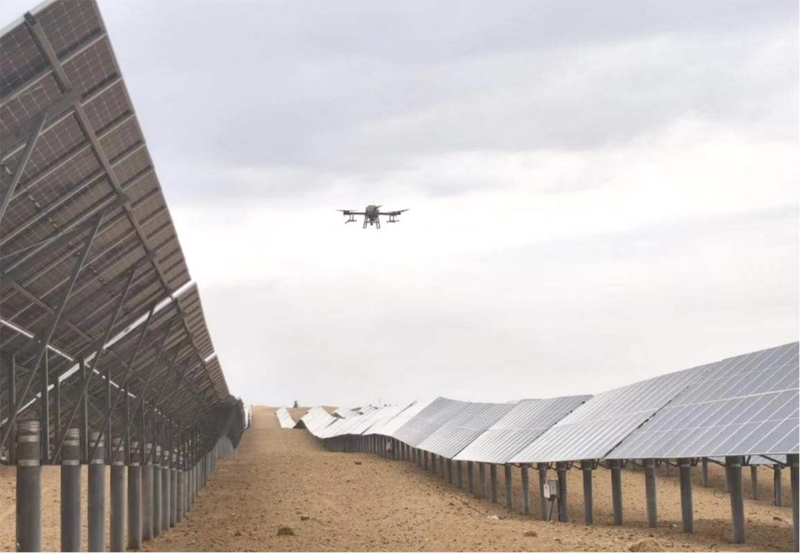 一架飞播无人机从老韩的头顶上空呼啸而过,将混合草种精准撒向光伏板间的沙地。“大型无人机飞播一天能覆盖5000亩沙地,抵得上50个工人干一个月!”现场无人机飞播技术人员说。依托机械化作业,今年四五月间,库布其基地光伏一期成功栽植沙生灌木200余万株,覆盖整个场区的3万亩沙地。