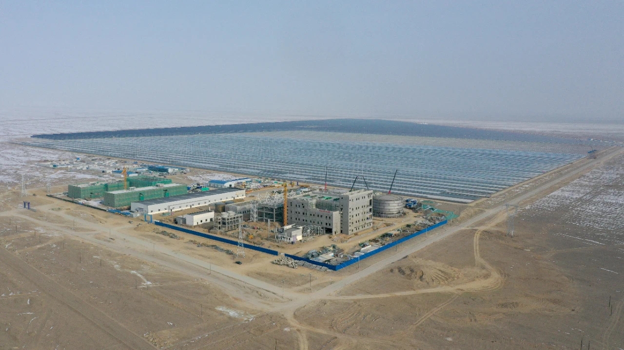 ▲在新疆哈密的茫茫戈壁上,10万千瓦“线性菲涅尔”光热储能电站和90万千瓦光伏电站毗邻而建。(资料图片)