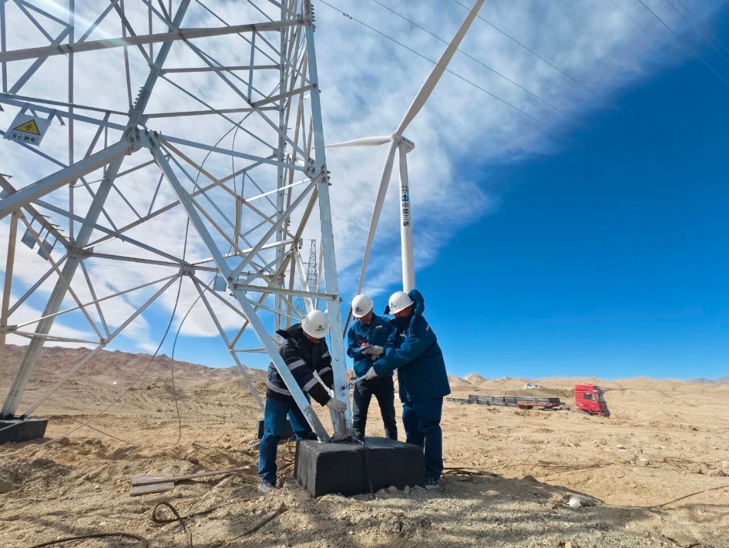 ▲ 运行团队正在检查送出线路铁塔基础安装情况,用严谨守护设备安全。